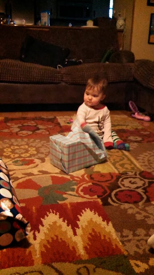 We had to wake up early this morning to get ready to go to Derick's mom's house first. It was 7:30 and the girls have been sleeping in until at least 9 lately. So they were still sleeping and we had to wake them up. MISTAKE. They started crying and throwing their faces into their mattresses. (I knew exactly what they were feeling....) We brought them to the Christmas tree to open presents and they had no idea what they were doing, of course. They were more interested in the paper than anything.